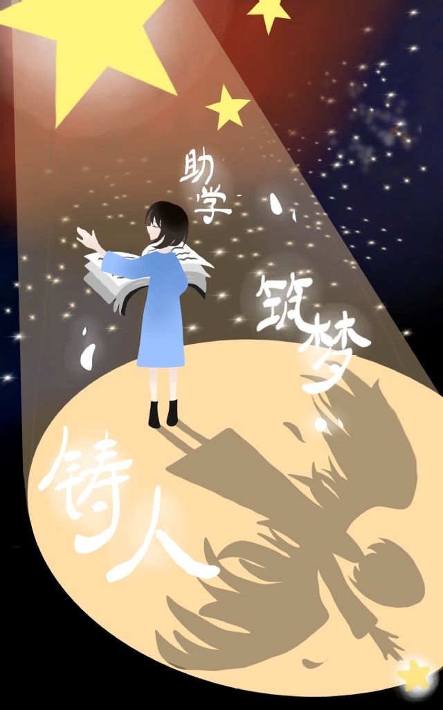 作品说明:作品中的主角表示受资助的学生,主角手里捧着书,向浩瀚的星空伸出手,寓意主角想在茫茫学海里更进一步。此时一束光照亮了主角,投射出的影子是长出翅膀的主角,以及触手可及的星星。其中,翅膀不仅是手中书本的投影,同时也是能使主角离星空更近一步的要素。而这束光来自于国旗的一角——象征着国家。作品的寓意为国家助学金帮助贫困学子在学习上更进一步,离梦想更近一步。