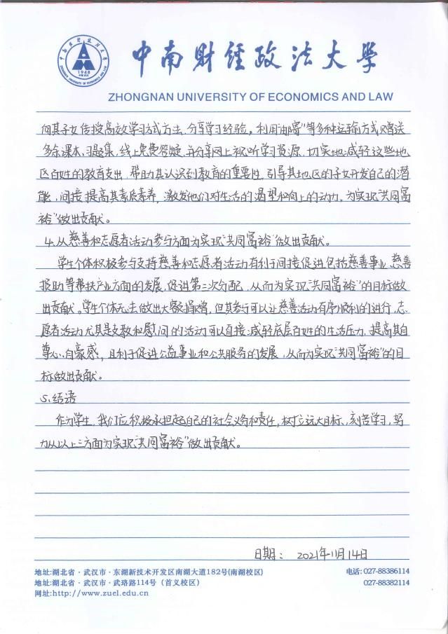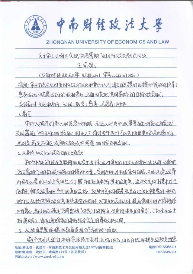 【梧桐树奖学金】财政税务学院王同锐——关于学生如何为实现“共同富裕”的目标做贡献的刍议