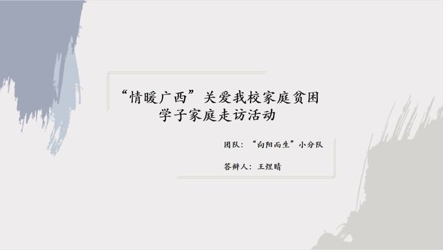 广西组的组长是王煜晴同学,她从团队介绍、实践过程梳理、实践成果展示和反思与建议四个方面对活动过程进行了阐释。通过线上调查和线下走访方式,调研了学生对我校资助政策的了解程度,并以饼状图的形式加以呈现。此外,他们还收集了受访学生的意见和建议,并通过推文来进一步宣传我校的资助政策。