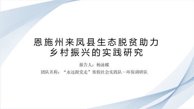 恩施组的组长是杨泳蝶同学,她从前期准备、中期调研、后期整理和调研结果四个方面进行了阐释。在乡村振兴背景下,他们以生态补偿为切入点,调查了农户生计资本评估等数据,研究分析了生态扶贫政策实施情况,以专业知识助力乡村振兴,最后走访了我校受资助学生,宣传国家和学校的资助政策。
