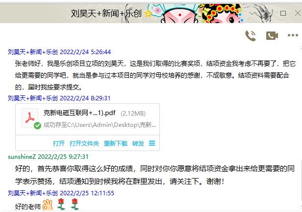 “张老师好,我是乐创项目立项的刘昊天,结项资金我考虑不再要了,把它给更需要的同学吧,就当是参与过本项目的同学对母校培养的感谢。结项资料届时我按要求提交。”