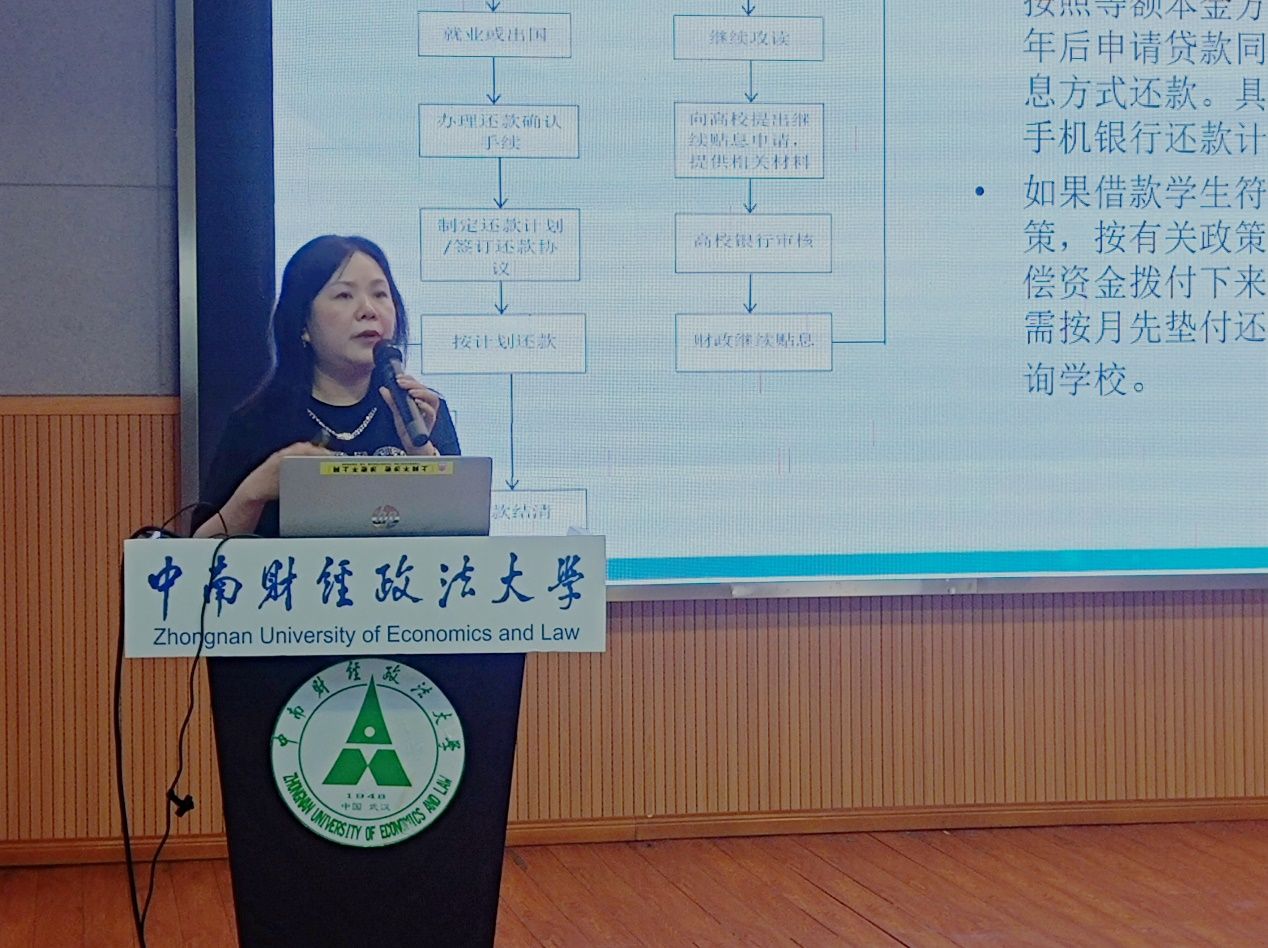为深入开展毕业生诚信教育,加强助学贷款贷后管理,确保毕业生顺利完成助学贷款还款确认工作。5月17日下午,我校举办2024届毕业生助学贷款诚信还款培训会。国家开发银行湖北省分行客户七处副处长武昭明,助贷经理陈富瑞、徐浩洋、胡琴,中国银行东湖分行助贷经理张洁、财大支行助贷专员蔡琴,党委学生工作部副部长兼学生资助管理中心主任葛明,学生资助管理中心老师及2024届贷款毕业生参加了此次会议。