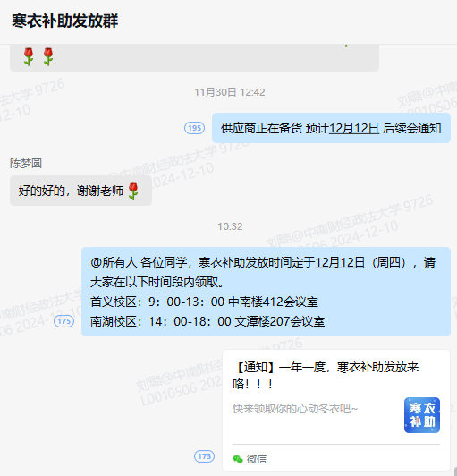 确定发放名单后,资助中心第一时间创建寒衣补助发放企业微信群,与学生建立直接联系,确保每位学生知悉寒衣发放时间和地点。发放当天,学生进行现场试穿,如尺码不合适可及时登记更换。