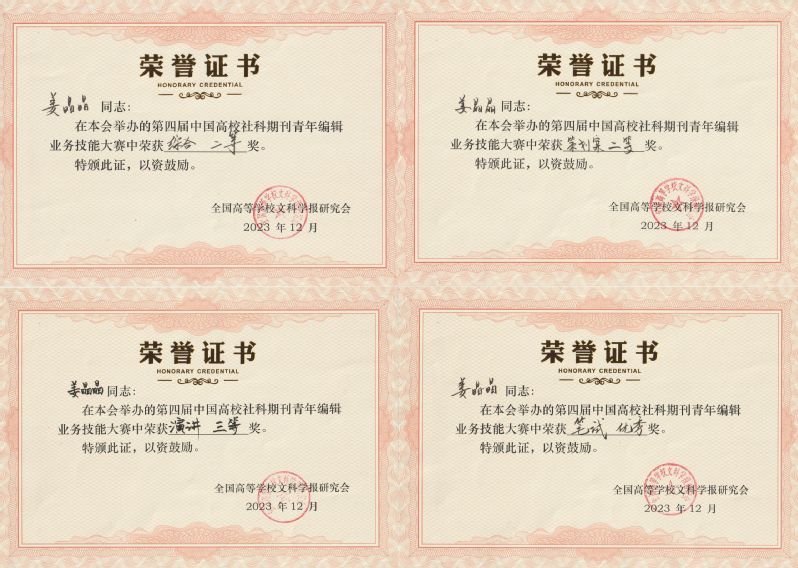 中国高校社科期刊青年编辑业务技能大赛是一项定期举办的全国性比赛,旨在从多角度考察青年编辑组织策划、把握学科发展动态和专业编校的能力。本刊一直鼓励青年编辑参加此项比赛,将其作为编辑队伍建设、同行交流的一项重要举措。今年是本刊编辑第四次参赛并获得奖项,充分展现了本刊编辑的职业素养和业务水平。未来,学报将继续加强编辑队伍建设,不断提高办刊质量,为学校一流学科建设做出更大贡献。