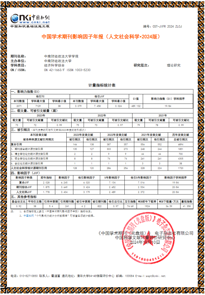 近日,《中国学术期刊影响因子年报》(2024版)发布。根据《中国学术期刊影响因子年报(人文社会科学·2024版)》最新数据,《米兰电竞·(中国区)学报》各项指标继续提升。学报复合影响因子达6.245,较上年提高7.12%;期刊综合影响因子为3.649,较上年增长31.45%;即年影响因子为2.028,较上年增长1.4倍。学报影响力指数CI值为489.132,在全国经济科学综合类学术期刊中排名第19位,位于Q1区,排名较上年提升5位。学报WEB即年下载率为1924,较上年增长95.53%。
