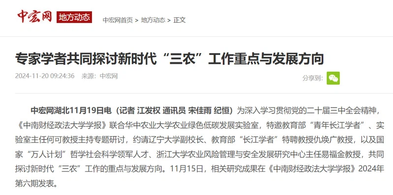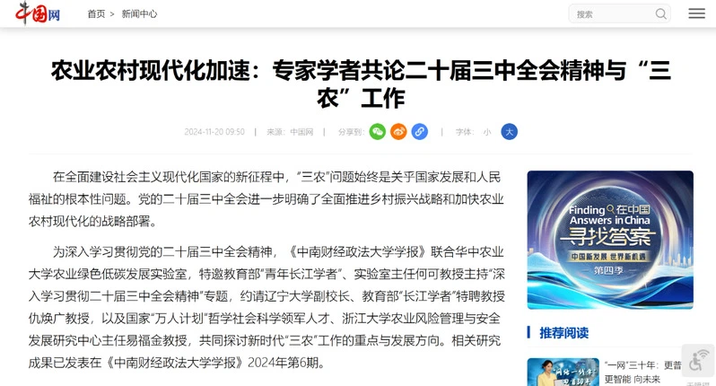 党的二十届三中全会进一步明确了全面推进乡村振兴、加快农业农村现代化的战略部署。为深入学习贯彻全会精神,本刊邀请何可教授主持“深入学习贯彻党的二十届三中全会精神”专题,约请仇焕广教授、易福金教授,共同探讨新时代“三农”工作的重点与发展方向。相关研究成果已发表在《米兰电竞·(中国区)学报》2024年第6期。