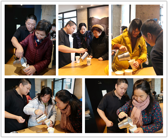 活动开始前,工作人员已为大家准备好鲜牛奶、咖啡豆、咖啡机、拉花壶等各种材料和设备。咖啡师Cory老师首先教大家拉花的制作要领,并现场带领大家尝试拉花的制作。学院女老师们依次体验咖啡拉花的乐趣,为自己制作一杯独一无二的拿铁咖啡,虽然做出来的拉花图案与想象中的不太一样,但品尝着自己的专属作品时,每个人脸上都洋溢着幸福的笑容。