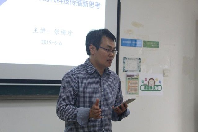 (学生记者王小娅)2019年5月6日下午,新闻与文化传播学院在文波楼208教室举办“人文与科技的交融—融媒体时代科技传播新思考”主题讲座。中国地质大学艺术与传媒学院副院长张梅珍教授担任主讲嘉宾,余秀才教授主持讲座。