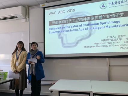 我院吴玉兰教授、刘兰珍副教授等一行应邀参加会议,并在分会场发言。7月9日上午,吴玉兰教授和其硕士研究生曾怡然在“Business Communication and Culture”分会场,以<Research on the Value of Craftsman Spirit Image Communication in the Age of Intelligent Manufacturing>为题,进行了15分钟的全英文汇报演讲展示。论文主要探讨智能制造时代工匠精神影像传播在价值选择和价值评价中的表现与不足,并从完善有深度有广度的价值选择的角度提出传播内容要深入智能制造设计、生产、管理、创新环节,传播主题融汇现代内涵,传播视角多元化等思考。论文提出的将传统的中国工匠精神引入智能制造这一新颖观点引起了现场国外学者的浓厚兴趣,与会学者纷纷就工匠精神及其传播、中国智能制造2025计划进行了讨论,该论文得到了专家们的好评。