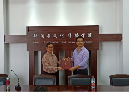 (学生记者陈燕)10月24日下午,滕忠勤先生客座教授聘任仪式,在新闻与文化传播学院(以下简称新闻学院)文波楼510会议室成功举行。参与此次会议有新闻学院院长胡德才,党委书记黄俊雄以及副教授徐锐老师,聘任仪式完成后,滕忠勤教授讲解了世界财经电视媒体的生态与发展趋势的相关问题。