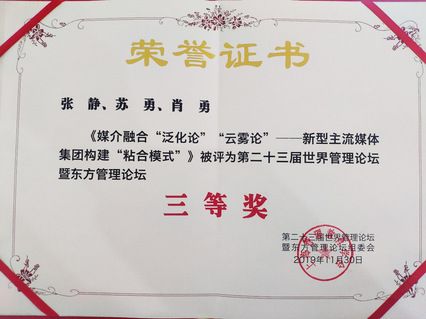 本文创造性提出了 “云雾论”,即5G时代“头顶有云层,下有雾层,连接用户终端”,千姿百态个性化需要的信息像云雾状主动推送到独具个性的网民移动设备上。自媒体平台微信语音通话与视频,拉近了受众与场景间的距离,如在眼前,沟通交流,形成狂欢化的开放式信息内容传播“粘合”模式系统,成为新型主流媒体集团媒介融合的核心纽带。在闭幕颁奖仪式上世界管理协会联盟(IFSAM)主席亲自为张静老师颁发三等奖证书。