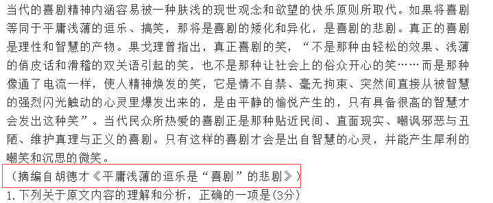 《平庸浅薄的逗乐是“喜剧”的悲剧》一文曾发表在《光明日报》2017年10月6日06版。文章指出“喜剧文化日益成为中国审美文化的重要形态”,但喜剧发展进程中也存在“将喜剧等同于娱乐、被扭曲矮化进而丧失乐观自由、理性超脱、自由狂欢的喜剧精神”问题。文章通过举例、对比论证指出喜剧艺术作品应高扬喜剧精神,“贴近民生、直面现实、嘲讽邪恶与丑陋、维护真理与正义”,喜剧作品要出自“智慧的心灵”,产生“犀利的嘲笑和沉思的微笑”。文章全篇语言凝练、逻辑严谨、论述深入、引人思考,被选做高中语文论述类文本阅读试题恰到好处。