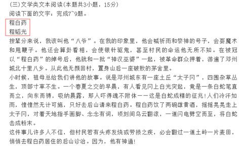 小说作品《程白药》以第一人称视角讲述了一位传统医术高超、抗战屡立奇功、历经波折郁郁不得志,在非议中坚持治病医人,事迹为乡人口口相传的“八爷”的传奇故事。故事短小精悍,情节感人,代入感强。该文曾刊发于《小小说选刊》,并发布在江山文学等网络文学平台,是一部很受欢迎的小说作品。对于文章入选高考模拟试卷,作者程韬光说:“这让我再次对创作保持敬畏之心!因为它将潜移默化地影响学子们的人生观、世界观。同时,这也督促我更好地利用碎片化事件,去多写一些有意义的短作品。”