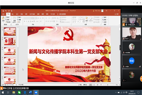 (学生记者 陈旭彬 陈潇雅)6月16日下午,新闻与文化传播学院本科生第一党支部以线上会议的方式开展支部党员大会。会议主要讨论支部15名预备党员的转正事项。支部书记韩桢及24名正式党员、全体预备党员参与本次大会。