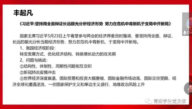 首先,丰起凡同志带领大家集体学习了《习近平:坚持用全面辩证长远眼光分析经济形势 努力在危机中育新机于变局中开新局》,当前我国的经济正处于转变发展方式、优化经济结构、转换增长动力的攻关期,由于新冠肺炎疫情冲击世界经济深度衰退、国际贸易和投资大幅萎缩。在这种情况下更应该发挥我国作为世界最大市场的潜力和作用,明确供给侧结构性改革战略方向,确保完成决胜全面建成小康社会、决战脱贫攻坚目标任务。接着李雨蒙同志就《2020年政府工作报告》做了解读,做好今年政府工作,要在以习近平同志为核心的党中央坚强领导下,以习近平新时代中国特色社会主义思想为指导,全面贯彻党的十九大和十九届二中、三中、四中全会精神,坚定实施扩大内需战略,维护经济发展和社会稳定大局,确保完成决战决胜脱贫攻坚目标任务,全面建成小康社会。