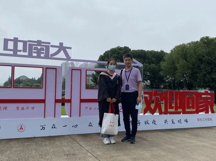 返校第一天,吴玉兰老师特地赶来学校,和她门下的研究生苏畅告别。苏畅是吴老师门下唯一一个不在武汉本地工作的学生,她当天就要离开学校去深圳,师生便相约在文波楼,依依话别。在毕业生返校的这段时间里,吴老师多次赶来学校,为的是不错过每个学生的毕业仪式,努力陪伴每个毕业生“一起毕业”。“我们来的很散,她却在每个学生离开的时间都来。”吴老师的学生曾怡然在接受采访时说道。由亲爱的老师送别,离开前再与中南大进行一场真实的对话,毕业生们的毕业旅程带着祝福和殷切的叮嘱。