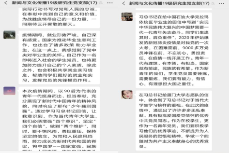 (通讯员 程晓 段文钰 张悦晨)7月17日、18日,新闻与文化传播学院18级、19级研究生党支部分别开展7月支部主题党日活动。两个支部全体党员同志通过线上讨论的方式参与此次活动。本次党日活动主要内容是学习回信精神,勇担时代使命;讲好战“疫”故事,激发爱国热情。活动分别由18级研究生党支部书记张悦晨和19级研究生党支部书记陈儒主持。