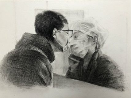 在绘画类作品中,作者们大多将自己的目光聚焦于疫情期间的战士们。有着重刻画钟南山院士的《抗疫国士,大爱无疆》;也有描绘疫情期间普通医护工作者的《希望》、《玻璃之侧》等。这些作品均在此次大赛中获得了优异的成绩。其中,素描作品《吻》脱颖而出,荣获一等奖。作者谢晨辉表示,这幅画的创作灵感来自于疫情期间浙江的一名95后抗疫女护士陈颖与男友隔着玻璃门深情一吻的动人画面。作者用自己的画笔记录下这个动人的时刻,把这份感动传递给更多人。