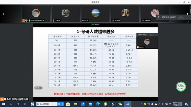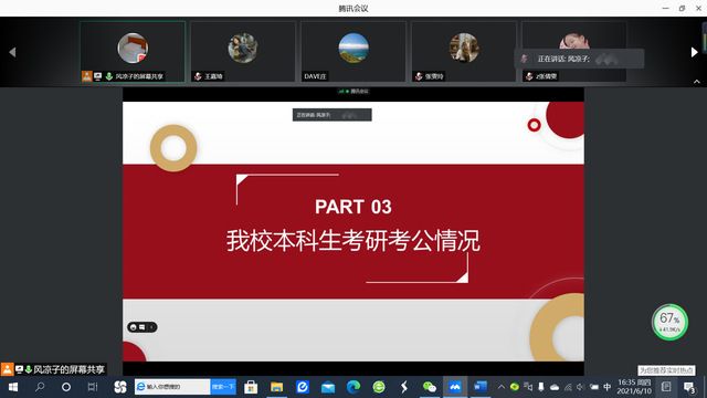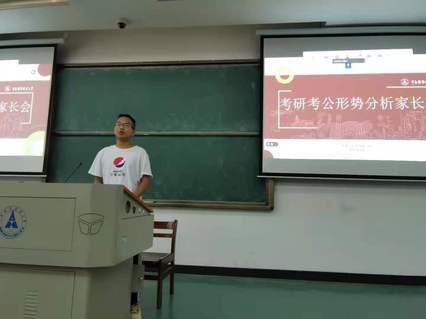 (学生记者王嘉琦)为使2018级本科生生更从容地面对即将到来的考公、考研、就业等事项,6月10日下午,按照学校就业指导服务中心工作要求,结合学院实际,2018级辅导员韩桢通过腾讯会议召开家长会,作考研考公形势分析报告。2018级本科学生家长代表在线参加会议,部分本科生线下参与报告会。报告从全国考研考公形势分析、学校考研形势分析、学院考研考公情况层层深入,最后给出对策建议,以期在六月这个关键时刻帮助学生做出适合自己的选择。