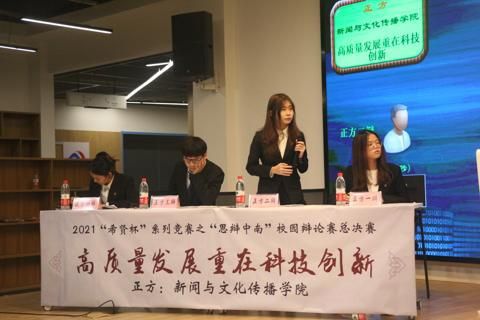 (学生通讯员 陈思妤 王寅雪)12月16日晚,2021年“希贤杯”系列竞赛之“新时代·新青年·新使命”校园辩论赛总决赛在南湖校区大学生素质教育中心路演厅拉开帷幕。此次辩论赛围绕“高质量发展重在科技创新还是制度创新”展开,正方是新闻与文化传播学院(以下简称“新闻学院”),持方向为“高质量发展重在科技创新”。反方是金融学院,持方向为“高质量发展重在制度创新”。新闻学院的参赛选手有:一辩邹蓉,二辩柳媛,三辩程英琦,四辩张琳梦。双方选手在立论、攻辩、自由辩论、总结陈词等环节尽显风彩。