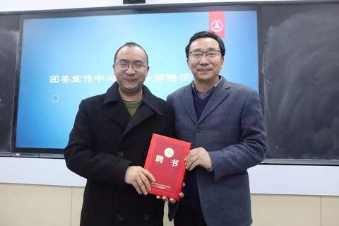 首先,举行团委宣传中心指导老师聘任仪式,新闻学院党委书记黄俊雄为党委宣传部、校报总编辑陈博颁发聘书。