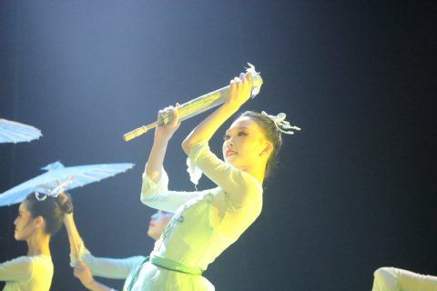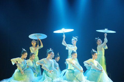 青春点燃热情,舞蹈传递梦想。《雨涧春行图》呈现出一幅江南女子在春雨中、山涧里翩翩起舞的灵动画面。舞蹈演员手执纸伞,迈着优雅的步伐缓缓走上舞台。蓝色灯光洒下,轻柔平和的背景音乐响起,清雅的乐声中夹杂着潺潺雨声。随着一柄柄纸伞缓缓打开,身着青白色莲裙的演员们轻舞旋转,仿佛正漫步于雨涧中,以轻盈灵动的舞姿绘出一幅动人的江南雨涧春行图。整齐的舞蹈动作让观众在舞动中看到了流动,看到了生长,看到了希望。