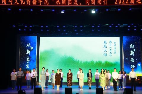 新闻学院院长罗晓静、副院长张雯、党委副书记赵晓,毕业班班导师及各系教师代表带来的经典作品选读让晚会气氛达到顶峰。老师们用声声呢喃叮嘱学子要《永远的憧憬与追求》,以亲切的嗓音诉说着自己与学子们共度的《匆匆》;在眷念往日之时演绎《童年》;教会学子拥有《风中跌倒不为风》的坚强;回忆带领学子走过的信仰之路,进行一场《美学散步》;教导学子“天行健,君子以自强不息”即是《温和的修养》……师生群诵字字珠玑,《热风》呼吁青年有一分热,发一分光!《此去是星辰大海,归来仍风华少年》正是送给毕业生最好的礼物。