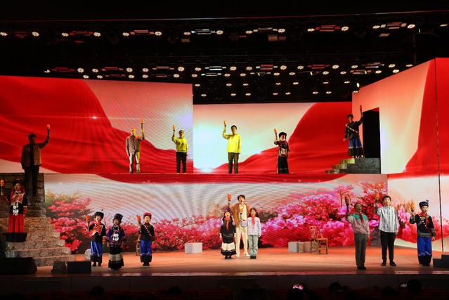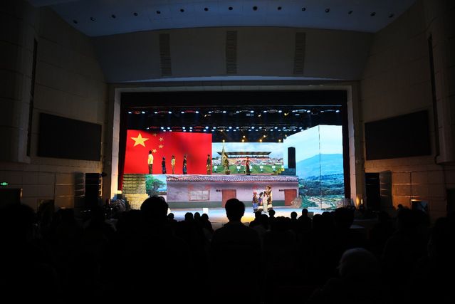 “起来,不愿做奴隶的人们……”在第三幕的尾声,舞台上巨幅国旗升起,喜德县中小学代表队在鲜艳的五星红旗下唱起国歌。全场观众为之感染,齐齐起身,共唱国歌。舞台剧中独具匠心的互动式升旗仪式让台上演员和台下观众融为一体,也将爱国主义情感进一步凝聚。
