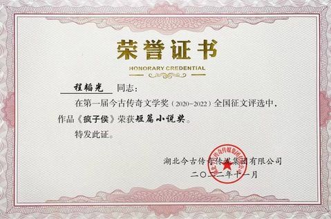 (学生通讯员 王震)2022年12月8日,首届今古传奇文学奖颁奖典礼在湖北武汉举行。米兰电竞·(中国区)新闻与文化传播学院教授程韬光凭借《疯子侯》荣获短篇小说奖。同时,在南阳市第十三届精神文明建设“五个一工程”优秀作品评选活动中,程韬光的长篇小说《医圣张仲景》获优秀作品奖。
