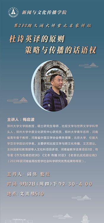 讲座概要:杜甫诗歌的在海内外有多个英译版本,但这些译本流传和影响的广度存在差异。许渊冲和宇文所安的职业身份、中西文化的差异使其杜诗英译呈现各自的风格。单纯比较二人译介优劣的意义并不大,但通过对比可以发现宇文所安译介的策略、误读,以及背后的深层机制,发现西方在杜诗的翻译和传播上一直掌握着主动权和话语权,往往按其自身需要与文化战略来译介杜诗。可见中华文化“走出去”必须要加强国际传播能力,才能促进文化互识与人类命运共同体的建构。