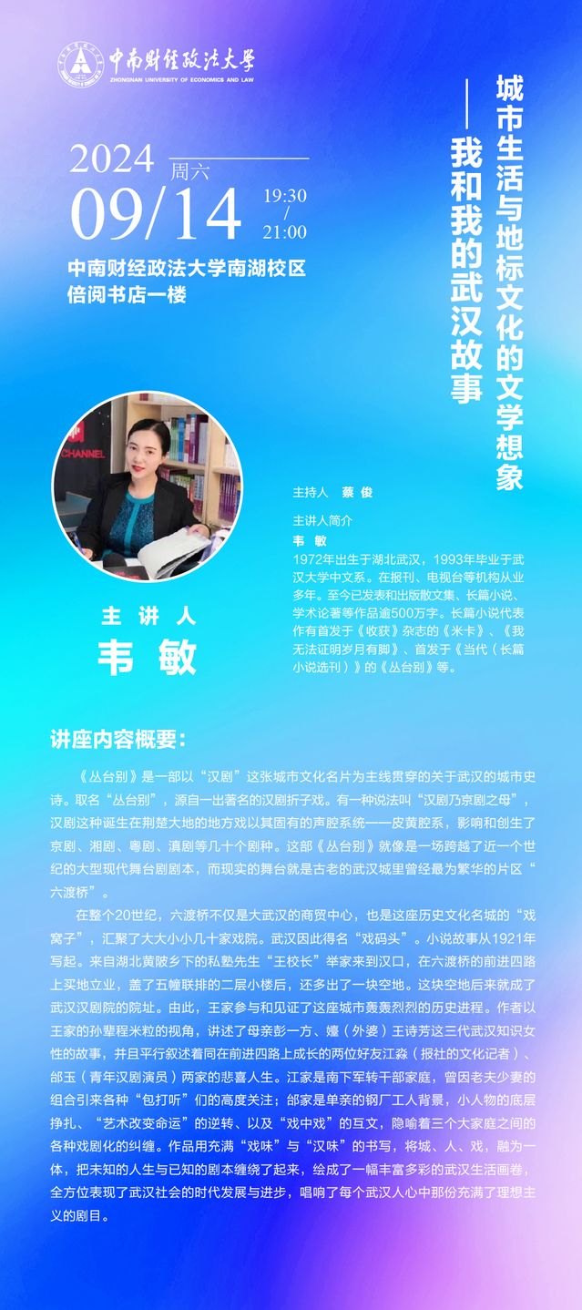 【讲座预告】韦敏:城市生活与地标文化的文学想象——我和我的武汉故事