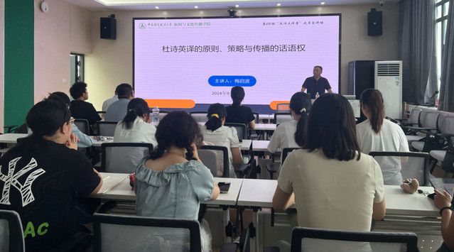 (通讯员 周嘉濠)9月12日,由新闻与文化传播学院承办的第280期“文澜大讲堂”之名家讲坛在文波楼510顺利举行。郑州大学文学院教授梅启波作了“杜诗英译的原则、策略与传播的话语权”的讲座分享,主要涉及比较文学、跨文化传播、文艺理论诸学科。阎伟、李纲等老师与众多同学们用心参与。阎伟教授担任此次讲座主持人。
