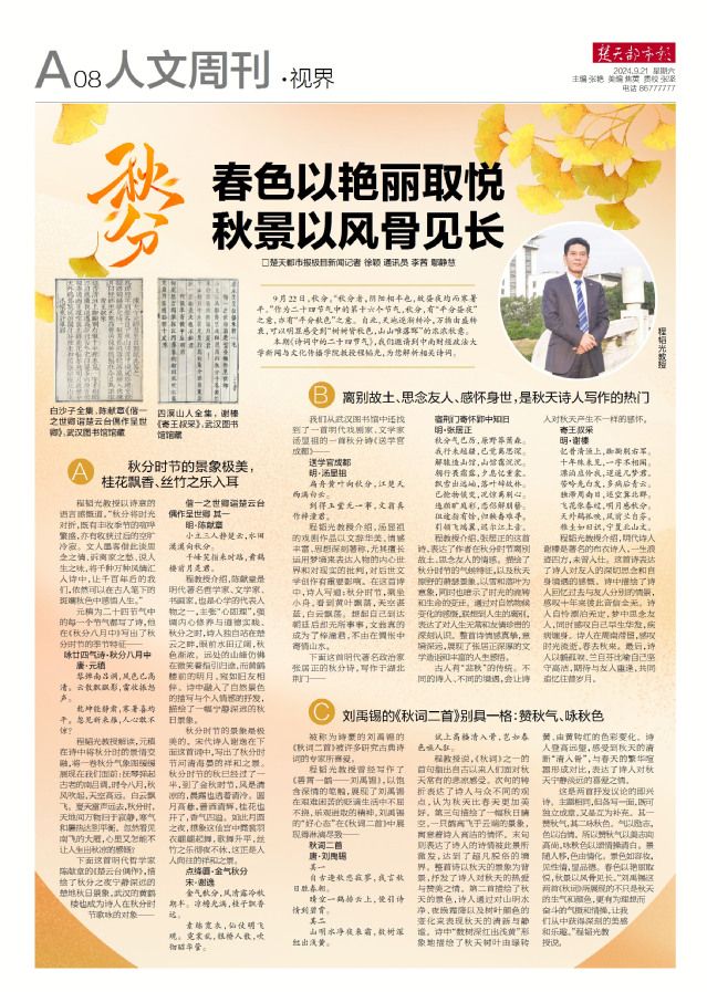 程韬光教授以诗意的语言感慨道,“秋分将时光对折,既有丰收季节的喧哗繁盛,亦有收获过后的空旷冷寂。文人墨客借此谈思念之情、诉离家之愁、说人生之味,将千种万种风情汇入诗中,让千百年后的我们,依然可以在古人笔下的斑斓秋色中感悟人生。”