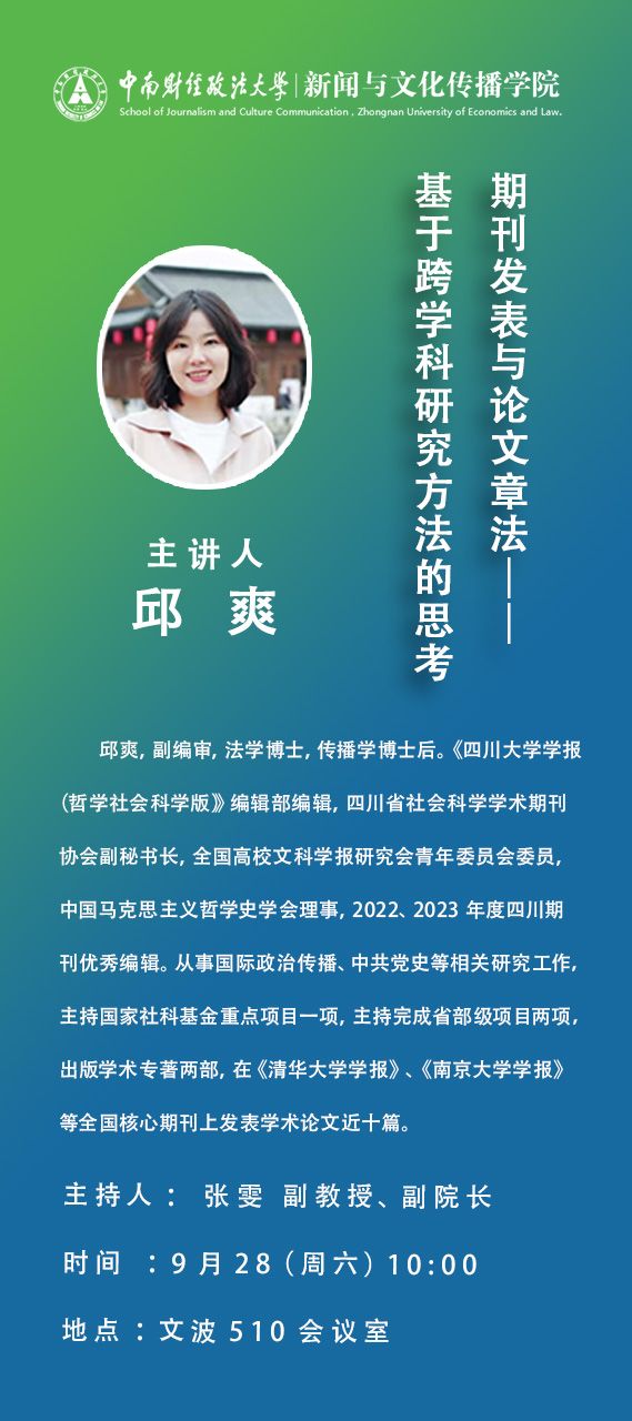 【讲座预告】邱爽:期刊发表与论文章法——基于跨学科研究方法的思考