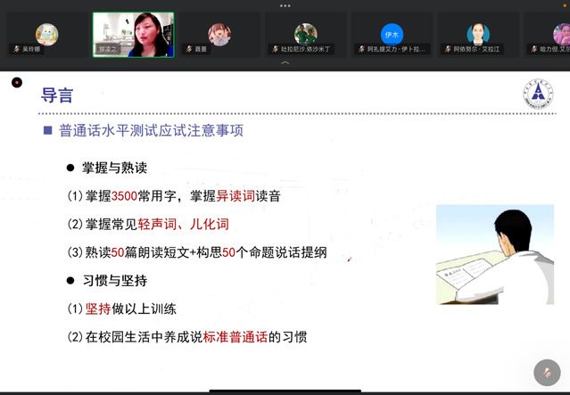 在集体大课中,六位教师围绕七大主题,精心构建课程内容。从基础的语音学常识、声调学习、声母与韵母训练,到深入的汉字文化与规范解析、语流音变探讨,再到中国经典文学的鉴赏与普通话测试注意事项的细致讲解,这些课程不仅覆盖了普通话语音知识以及发音的基础训练,更深入挖掘了汉语言文化的规范标准与深厚底蕴,为和田县的教师们搭建了一个全面、系统的学习平台。