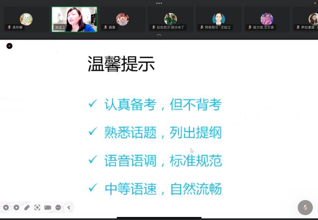 最后一次大课授课中,柳凌之老师凭借丰富的普通话测试指导经验,为教师们即将参加的普通话水平测试提供了全面而细致的指导。柳老师从普通话水平测试流程着手,对读单音节字词、读多音节词语、朗读短文、命题说话四个测试内容进行了细致入微的讲解,同时鼓励教师们积极参与课堂互动,通过朗读、模拟测试等多种形式加深学员的理解与掌握。针对教师们在朗读过程中遇到的困难,柳老师耐心解答与指导,帮助他们克服难关,训练效果显著。她总结的三十二字“宝典”——“认真备考,但不背考;熟悉话题,列出提纲;语音语调,标准规范;中等语速,自然流畅”,更是为教师们提供了宝贵的备考建议。课程最后,柳老师也预祝所有和田县的老师在普通话水平测试中取得优异成绩。