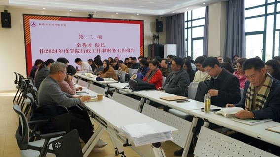 新闻与文化传播学院院长余秀才作2024年度学院行政工作和财务工作报告。他全面回顾了过去一年学院在学科建设、师资队伍建设、教学科研成果、学生培养等方面的成果,详细汇报了学院财务收支情况。并对2025年工作进行了展望,提出要进一步加强学科建设,提升教学质量,加大科研创新力度,优化师资队伍结构,推动学院各项事业高质量发展。