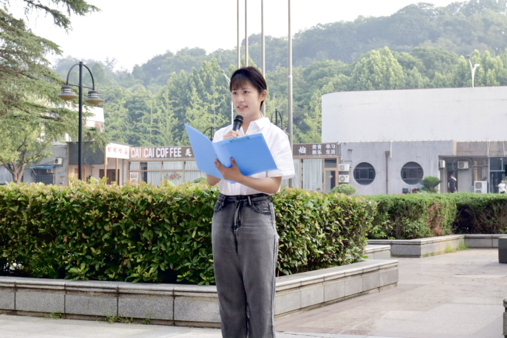 升旗礼毕,来自信息2403班的学生代表张祺沅发表国旗下的演讲。张祺沅分享了大学一年在学习方法、科研竞赛选择、学生工作目标及生活适应心态等方面的经验与感悟。