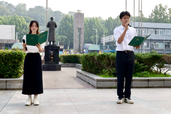 随后,新闻与文化传播学院本科生陈钰含、金岳颀朗诵爱国诗篇《我的南方和北方》。以祖国地理人文为脉络,通过对比南北方自然风貌与文化特质,表达对祖国锦绣山河的热爱与文化传承的使命感。