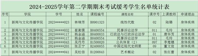 根据教务部《关于做好2024-2025学年第二学期本科期末考试安排的通知》要求,经学生个人申请,学院审核,现将缓考结果公示如下: