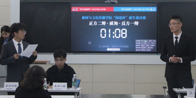 (学生通讯员 陈怡婷 蒋欣烨)11月20日下午,新闻学院第十四届“闻道杯”新生辩论赛决赛在文波109举行。本场比赛围绕“原生家庭批判是否让年轻人更幸福”这一热议话题展开交锋。正方的四位辩手分别是网法2501梁博容、新闻2501黄禹铭、新闻2502马菁苡、新闻2503朱新城。反方的四位辩手分别是中文2501常嘉俊、新闻2502贺国锐、网法2501刘缘铖、新闻2503石宇煊。出席此次辩论赛的评委有学院团委书记杨倩文、2024级辅导员张宸浩、校辩论队队员付雅睿、院辩论队22级队长卢胤杰。陈鸿羽和林雪儿担任本场比赛的主席。