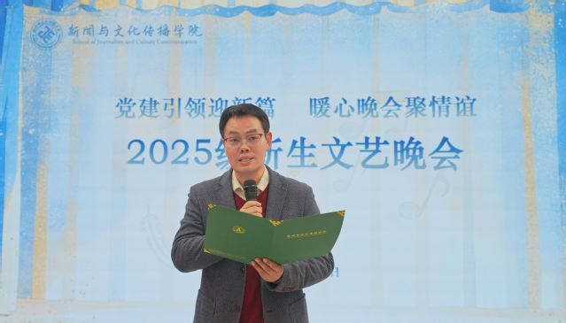 新闻与文化传播学院余秀才院长致辞,余院长对2025级新生的到来表示热烈欢迎,并鼓励大家在新的学习阶段积极进取、勇于探索,在新闻与文化传播学院这片广阔天地中追逐梦想、实现价值。