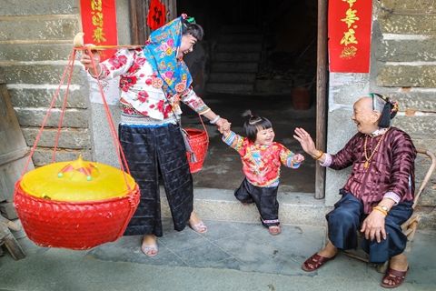 风景类单幅作品《庙妙》采用俯拍的手法,展现了空间的纵深感与深邃感。长巷里霓虹缤纷,人群穿梭,置身其间,不禁发出“不知今夕是何年”的喟叹。新闻纪实类单幅作品《渔家傲》则在构图上巧用心意,画面中分,天水各半。天上密云压城,江面尽是渔船。大气的构图使这幅摄影作品显得格外有沧桑感,具有震撼人心的力量。人物类单幅《三代欢笑》中,母亲头戴蓝头巾,穿着花衬衫,一肩挑着红艳的筐,另一只手牵着女儿的小手;女儿扎着俏皮的冲天辫,穿着喜庆的红褂,笑看奶奶;奶奶一脸慈祥笑看孙女,三代人的欢笑齐聚一堂。画面色彩明丽,喜乐欢笑呼之欲出。