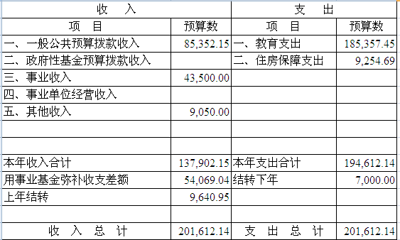 我校2016年预算收入201,612.14万元,比上年增加41,206.25万元,其中:上年结转9,640.95万元,占总收入的4.78%;一般公共预算拨款收入85,352.15万元,占总收入的42.33%;事业收入43,500.00万元,占总收入的21.58%;其他收入9,050.00万元,占总收入的4.49%;用事业基金弥补收支差额54,069.04万元,占总收入的26.82%。