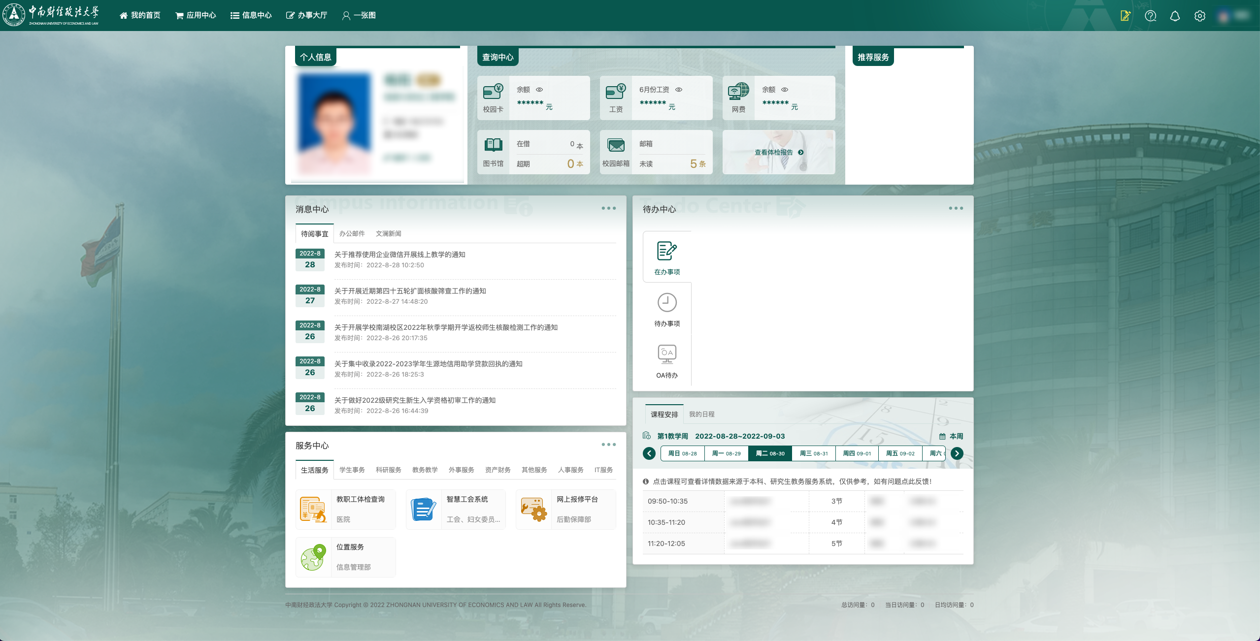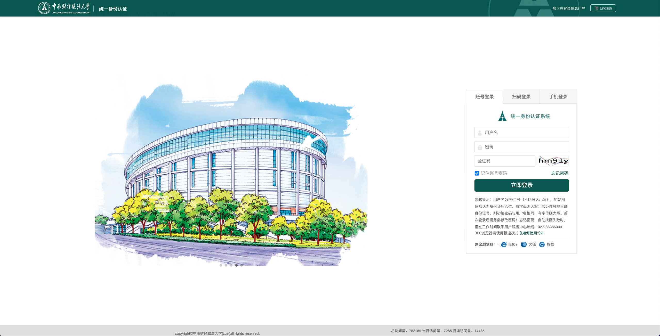 访问方式:http://i.zuel.edu.cn/,信息门户与我校统一身份认证进行了集成,点击登录,会自动跳转到身份认证登录界面。