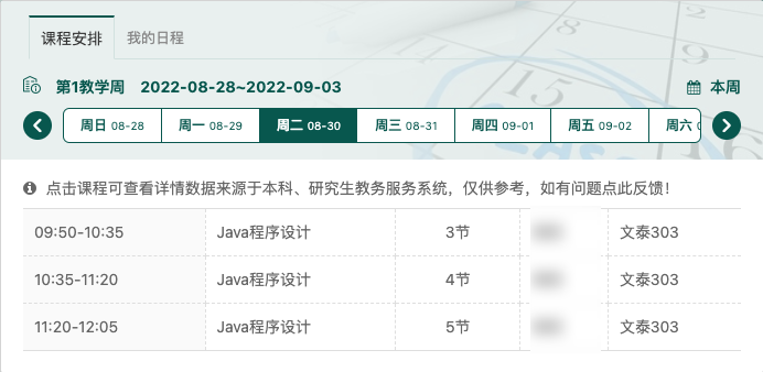 教师和学生用户登录信息门户后可通过该模块查看个人课表信息,如下图: