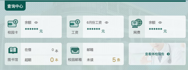 查询中心功能为用户提供多种信息整合,包括个人校园卡余额、网费余额、图书借阅超期数量以及校园邮箱的未读邮件数量,如下图: