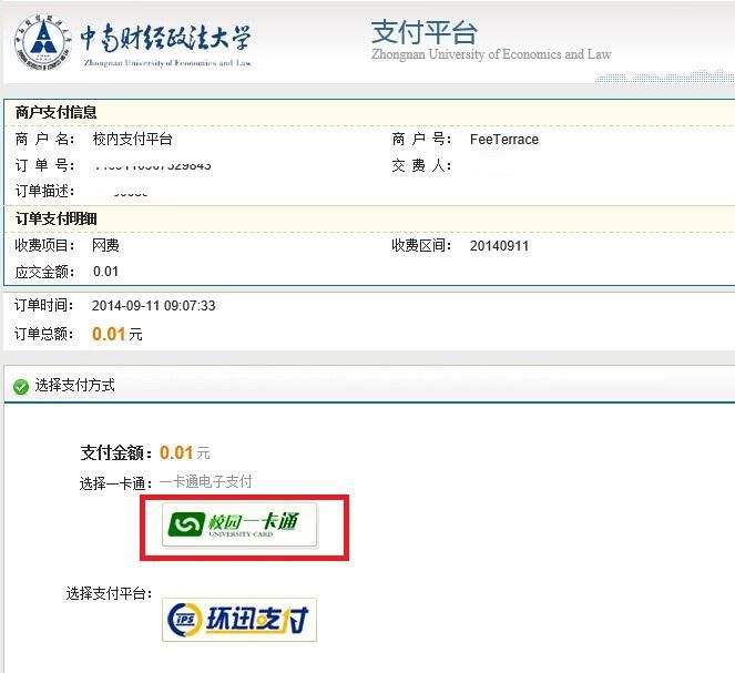 第三步:跳转到付款页面后,选择“校园一卡通”支付方式;