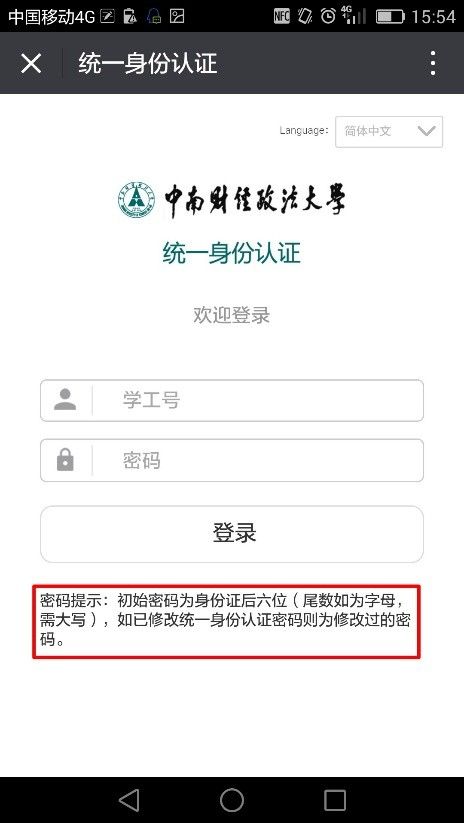 第三步:输入学号或工号以及密码,初始密码为身份证后六位(若身份证尾数为字母,则需要大写),若已修改统一身份认证密码,则输入修改后的密码。