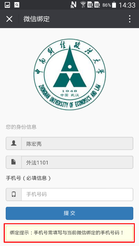 第四步:登录成功后,即可显示出姓名和部门信息,再在下方填写与当前微信绑定的手机号后提交,即关注成功。关注成功后即可进入“A.十九大知识竞答”应用参与答题。